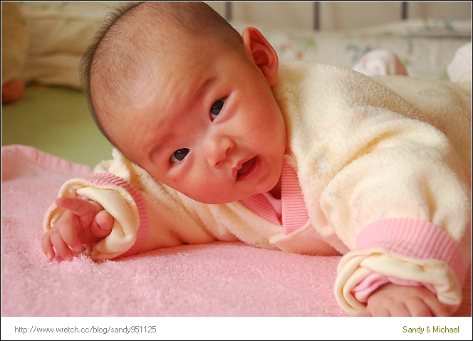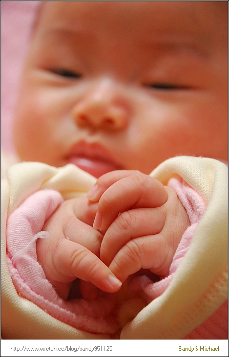 大約3個月的時候,發現柔柔開始注視自己的小手,很好奇地似乎發現了什麼?